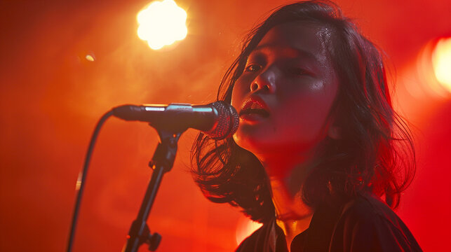 A close-up of the girl's face, lit by stage lights, highlighting her intensity and focus while singing.