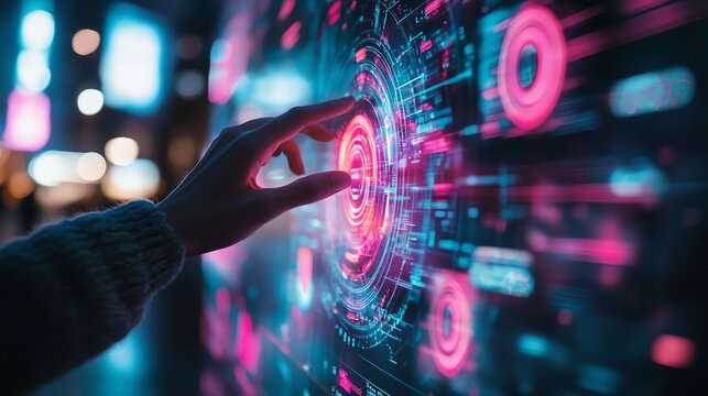 A persons hand reaches out to interact with the digital display of a cars infotainment system. The screen shows various icons and data, including navigation and music controls.