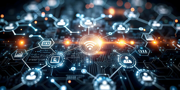 Soft Abstract Digital Lines Customer Support AI Icons Interconnectedness Bokeh Background Concept - Perfect for Illustrating AI Customer Service Strategies in Stock Photo Collections