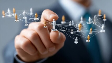 Networking Concept: A close-up shot focuses on a hand touching a network of interconnected human figures, illustrating concepts of connection and communication.