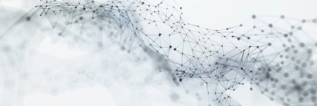 A complex web of connected dots and lines forms an abstract technological network, creating a dynamic and intricate pattern on a white background