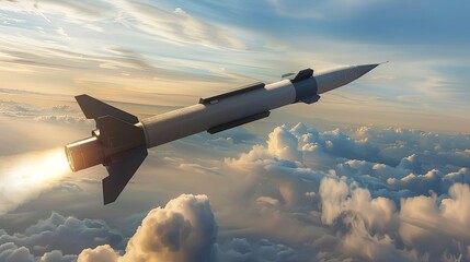 An intercontinental ballistic missile flies above the clouds. Tactical nuclear weapons. Air attack. Illustration for varied design.