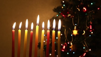 Footage of Hanukkah candles burning on the background of Christmas tree