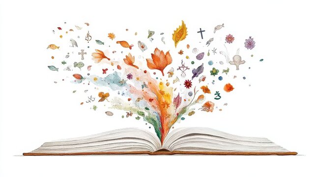 Vibrant Book with Colorful Symbols Representing Global Unity and Interfaith Harmony Celebrating World Harmony Week