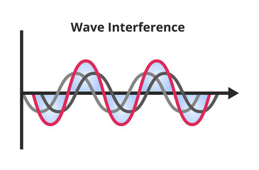 Vector scientific or educational illustration of wave interference – constructive interference isolated on white. Two waves with different phase and lower amplitude form a wave of greater amplitude.