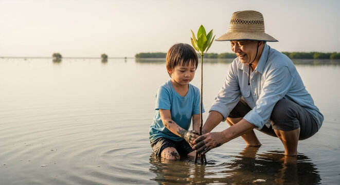 Asian father and son planting a mangrove seedling in the water. Mangrove reforestation and environmental education concept. Copy space for text.