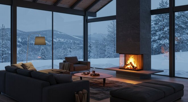 Cozy winter cabin living room with fireplace