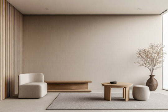 Minimalist Scandinavian - Japanese fusion interior design composition in neutral tones.Serene property interiors with ample copyspace.