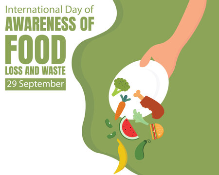 Vector graphic illustration of a woman discarding food into the trash, ideal for international awareness day of food loss and waste, suitable for greeting cards and celebrations
