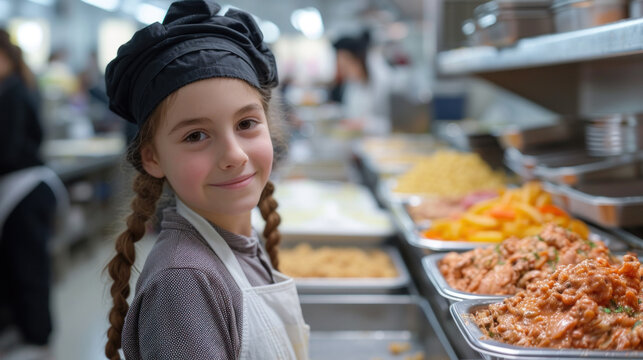 smiling cute girl is on duty in the school canteen and distributes food for lunch, for School Nutrition Day, banner
