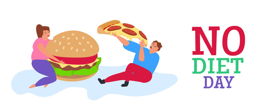 international no diet day man and woman eating big burger and pepperoni pizza slice vector illustration