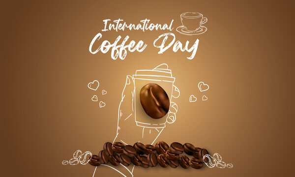 international day of coffee background with hand drawn and realistic llustration
