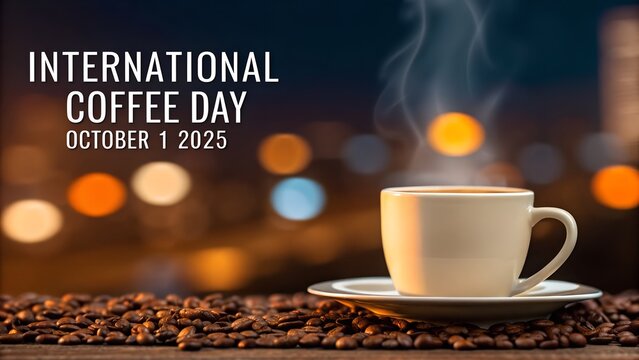 Celebrate International Coffee Day with a steaming cup of coffee and roasted coffee beans.