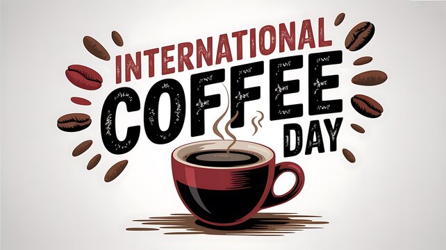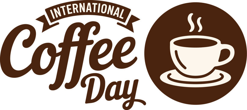 A cream colored coffee cup with a brown lid features the text International Coffee Day printed in brown, set against a neutral background celebrating the occasion.