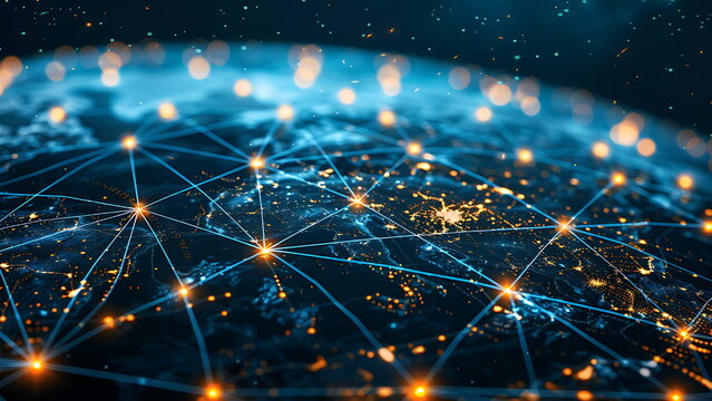 Global cloud computing network.  A network of interconnected icons representing cloud services overlays a globe,  illuminating the earth's cities