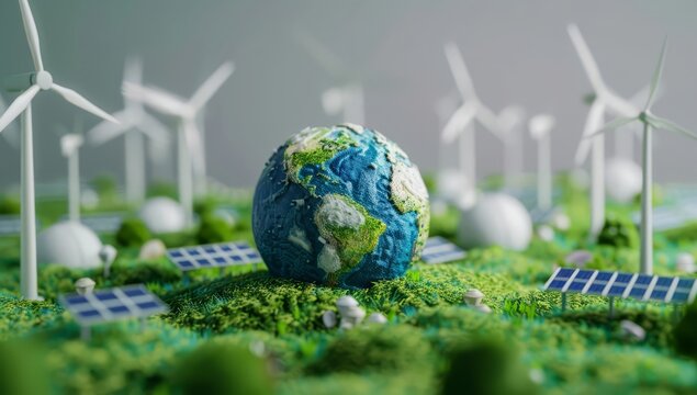 Clean energy concept on World Environment Day or International Day of Forests concept tree and earth globe with solar cell panel with windmill on nature background.