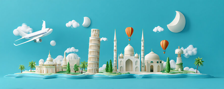 World travel concept showing famous landmarks and airplane flying across blue sky