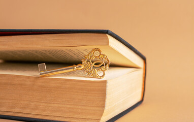 A old beautiful key between the pages of old book.
