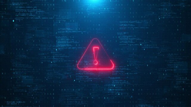 Man typing on laptop with a white exclamation point symbol; a system error warning