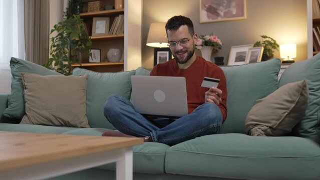 Man hand holding credit card and using laptop at home, Businessman or entrepreneur working, Online shopping, e-commerce, internet banking, spending money, working from home concept