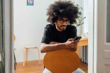Smart home technology interface on smartphone app screen with augmented reality (AR) view of internet of things (IOT) connected objects in the apartment interior, person holding device