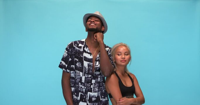 Studio, slow motion, young interracial couple posing together