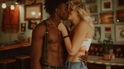 Interracial couple enjoying a romantic moment on a beach at sunset