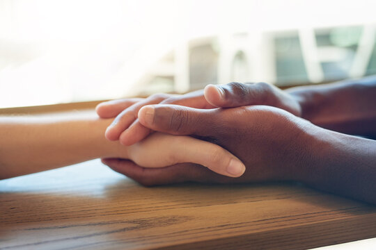 Holding hands, interracial and together for support, connection and trust in community with respect. Friends, people and empathy for relationship, kindness and praying for spiritual practice