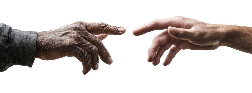 Two hands reaching towards each other, one dark-skinned, one light-skinned
