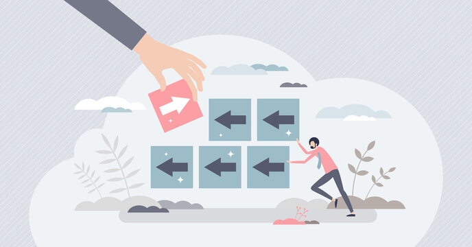 Man divides the arrow blocks into two parts. Interruption of the process, decreased activity. Stop financing and supply, slowing down progress. Incompetence and sabotage. Career end. poor performance