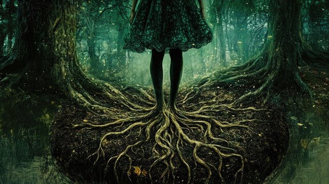 A surreal illustration of a woman standing in the forest, her legs slowly turning into tree roots, intertwining with the earth beneath her.