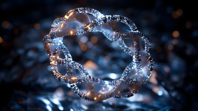 Illuminated ring of intertwined crystalline strands floating against a blurred backdrop