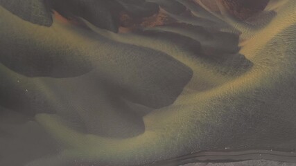 Aerial view of a braided river system creates a stunning landscape of interwoven channels and patterns, Fjósið Hallgeirsey, Rangárþing eystra, Iceland.