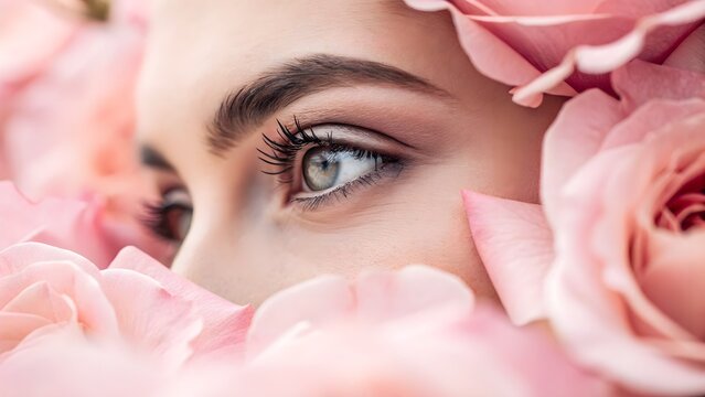 Romantic close-up: gentle petals framing a clear eye create intimacy and floral elegance—ideal for beauty or emotional storytelling visuals.