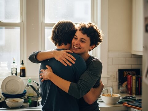 A happy couple hugs intimately in a sunlit kitchen, illuminated by bright window light. The woman smiles warmly while embracing the man.