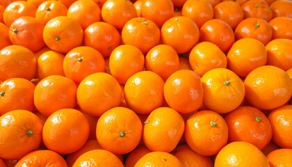 Pile of fresh oranges closely packed together, bright orange color with smooth dimpled skins, some with green stems.