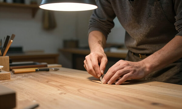 skilled artisan stands workbench closely framed natural wood grain soft overhead lighting casting warm glow hands