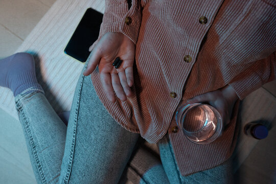 Woman holding medicine and water