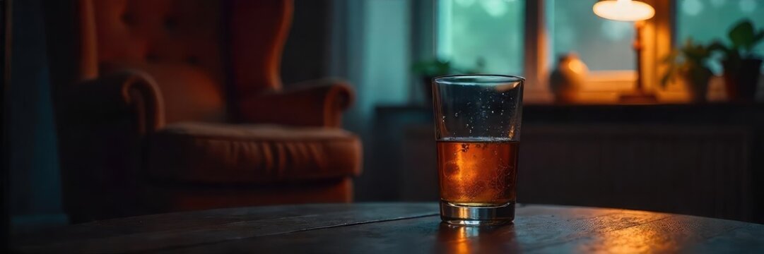 A dimly lit room, a half-empty glass, and a comfortable armchair suggest a state of relaxed inebriation The scene evokes feelings of comfort and mild intoxication , interior, relaxation, focus