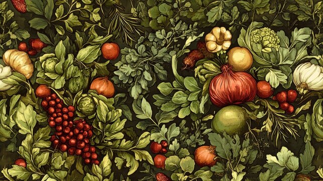 Intricate floral pattern featuring sketched leaves and branches against a dark green background.