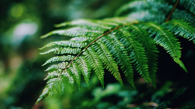 Vibrant green fern frond displays intricate details against a soft, dark background