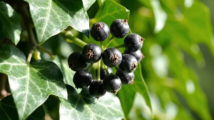 A detailed closeup shot of a cluster of dark ripe berries growing on a vibrant green common ivy plant showcasing the intricate patterns of its lobed leaves under bright natural sunlight in a lush gar.