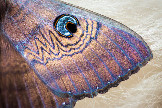 Close-up of the eyed cup moth, highlighting intricate wing patterns and vivid blue eyespots