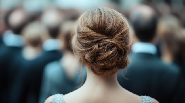 Elegant bride with intricate updo hairstyle and floral hair accessory, soft indoor lighting, bridal look