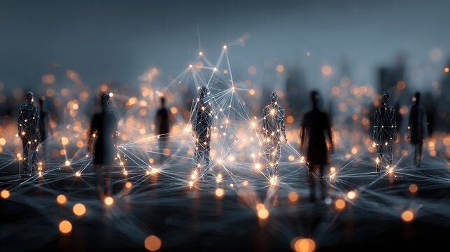 Digital Web of human in city: An abstract digital rendering shows silhouetted figures within a cityscape, intricately connected by a luminous network.