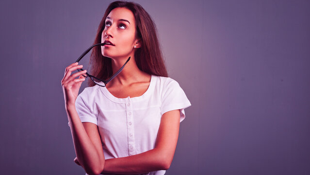 Black man in white office shirt and eyeglasses looks up thinking, wondering, taking decision. African American business manager with thoughtful face expression unsure, doubting, uncertain, hesitating