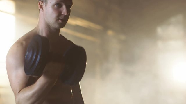 Muscular Shirtless Man Does Biceps Curls with Dumbbells Exercise, as Part of His Bodybuilding Gym Training. Shot on RED EPIC-W 8K Helium Cinema Camera.