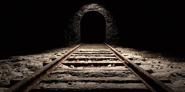 Tunnel vision: Old railroad tracks lead into the darkness, a passage to an unknown destination, shrouded in mystery and adventure, a dark and intriguing image.