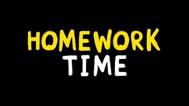Animated title with “HOMEWORK” in bold yellow and “TIME” in white, both handwritten over black. A dynamic and fun way to introduce homework segments in student or classroom content.