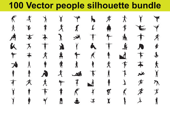 Vector art of a comprehensive collection of 100 vector people silhouettes, featuring a wide array of dynamic poses and actions this bundle is an invaluable asset for designers